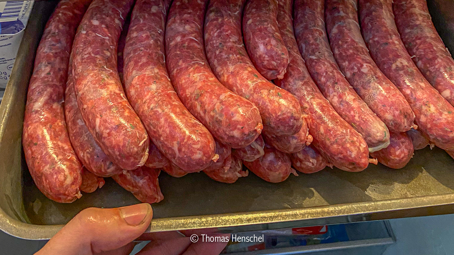 Unser Fleisch kommt in der Regel aus biologischer Weidetierhaltung, wobei der Focus auf der Pflege von Naturschutzgebieten liegt, und aus regionaler Jagd. So auch in diesem Fall: wir verwerten beispielsweise ein ganzes Wildschwein – von den unterschiedlichen Fleischstücken bis zu den Knochen (zur Herstellung von Wildfond). Aus unserer Sicht mit der nachhaltigste Umgang, was den bewussten Fleischkonsum betrifft. Hackfleisch und Bratwurst auf Vorrat Idealerweise