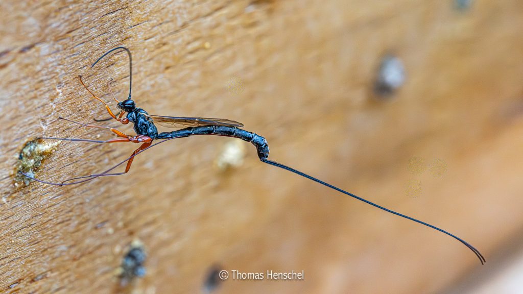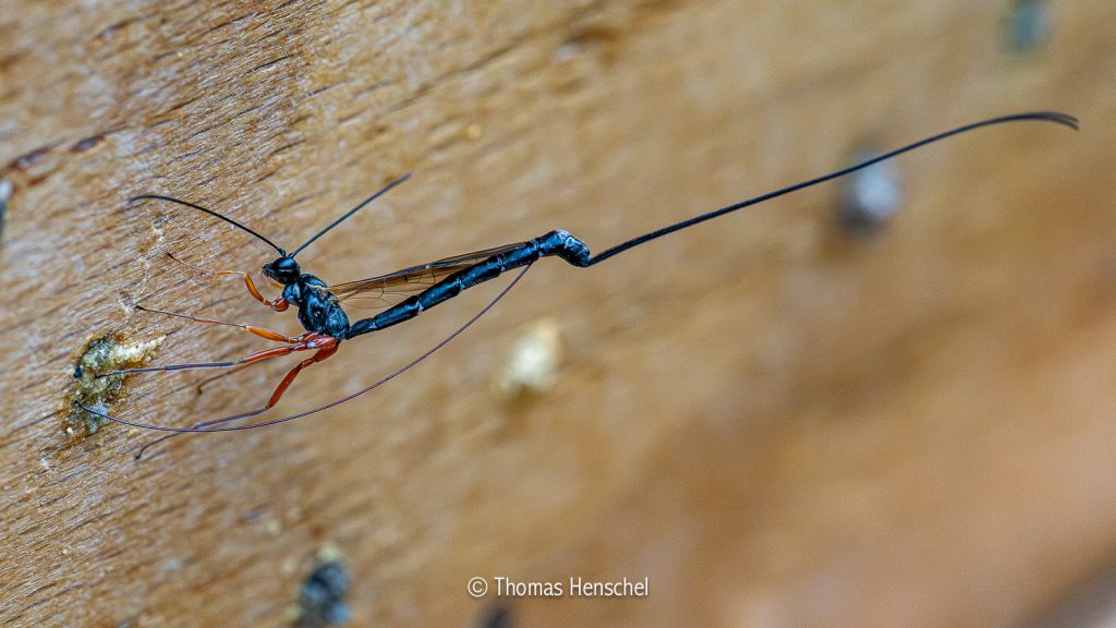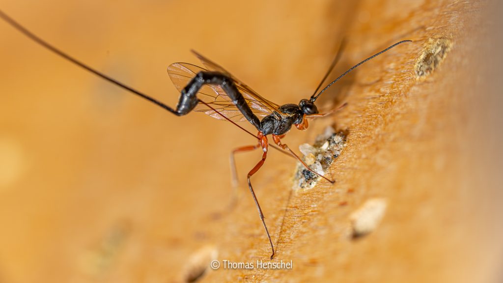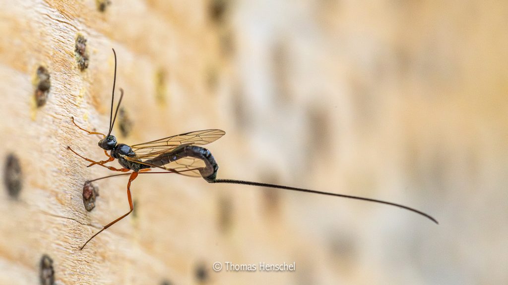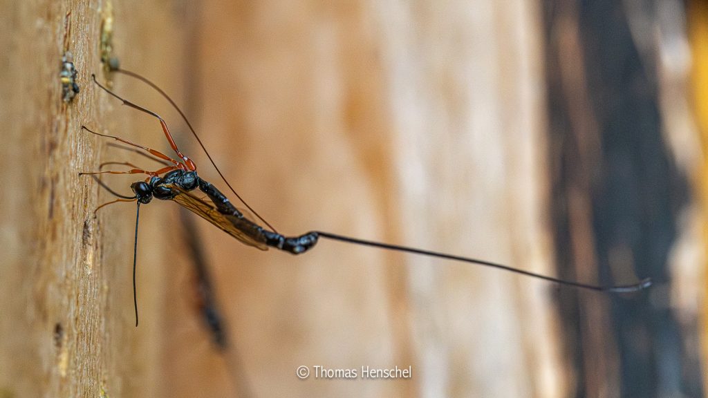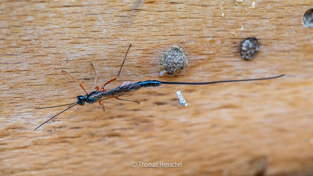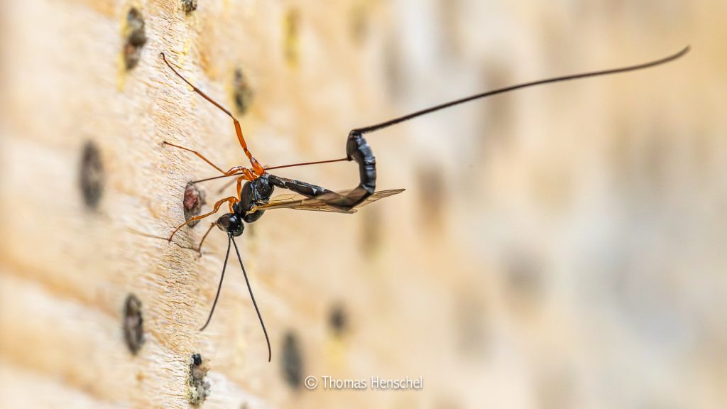 Eine Schlupfwespenart, es geht um die Rotbeinige Holzschlupfwespe (Ephialtes manifestator), ist emsig dabei, die verschlossenen Röhreneingänge zu untersuchen. Hat sie eine vermeintliche Schwachstelle gefunden, versucht sie ihren Legebohrer in die darunter liegende Kammer zu schieben um ein Ei abzulegen…