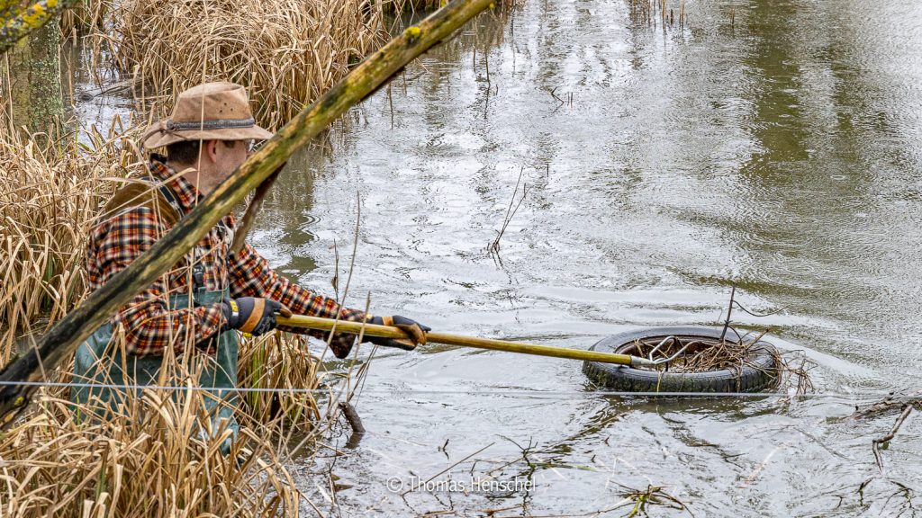 Treibgut, wie größere Äste, Pflanzenmaterial und auch Müll, sammelte sich vorm Biberdamm und konnte, nach vorheriger Absprache mit allen beteiligten Fachleuten, erfolgreich beseitigt werden. Wichtig war dabei, die Dammstruktur nicht zu beeinträchtigen, sondern nur die natürlichen Überläufe zu reinigen. Der durch die aktuellen Regenfälle erhöhte Druck auf den gestauten Bereich soll somit etwas entlastet werden.